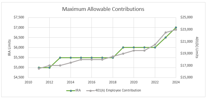 There are many different avenues and vehicles you can use for saving and investing for your future, whether that is after-tax vehicles like Roth IRA’s and Roth 401(k)s, or pre-tax vehicles like Traditional IRA’s, 401(k)’s, or 403(b)’s. Each of these retirement accounts have maximum contribution limits that are important to be aware of. As a result of inflation, the IRS raised the maximum allowable contributions of retirement accounts. Most retirement account limits are cost-of-living adjusted, so as inflation goes up, the limits should go up as well. Maximum allowable contributions into 401(k)’s went from $22,500 in 2023 to $23,000 in 2024. Looking at IRA’s (Roth and Traditional), their maximum allowable contribution increased to $7,000 from $6,500 for individuals under 50.